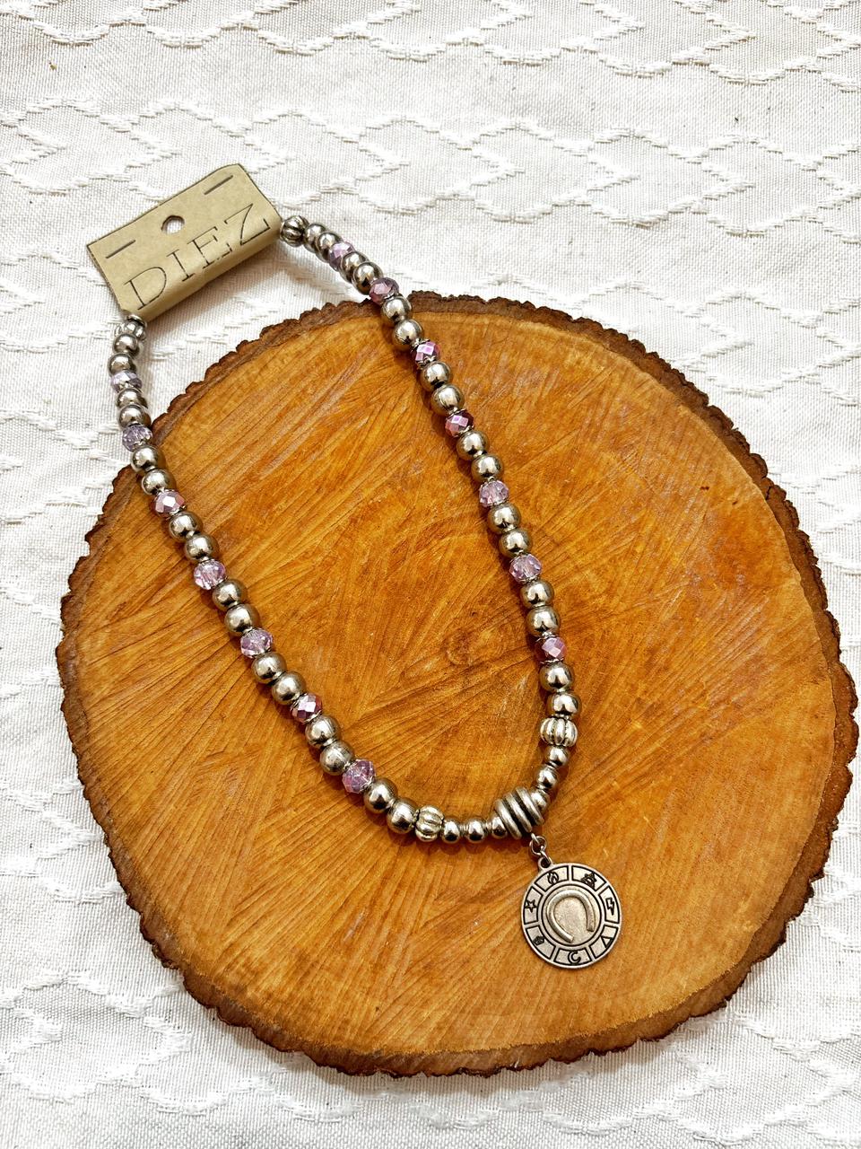 Collar elaborado con cristales en tonos violetas, bolitas metálicas y delicado dije circular, creando un diseño armonioso, luminoso y fácil de combinar.