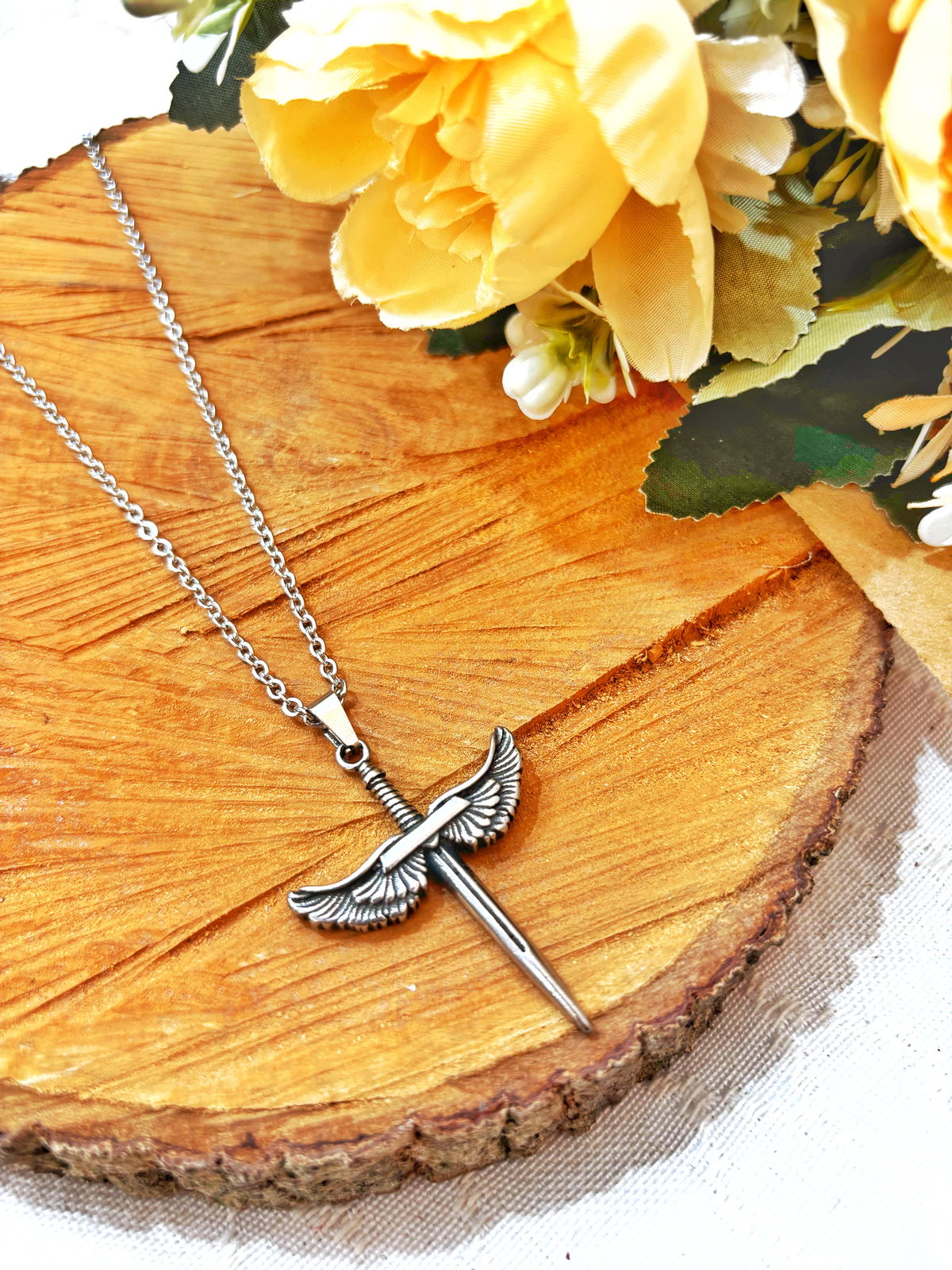 Este collar está realizado completamente en acero, con cadena resistente y cierre seguro. El dije central representa la Espada del Arcángel Miguel, símbolo de defensa frente a energías negativas y guía espiritual. Ideal para quienes buscan llevar un amuleto de protección y fuerza en su día a día.