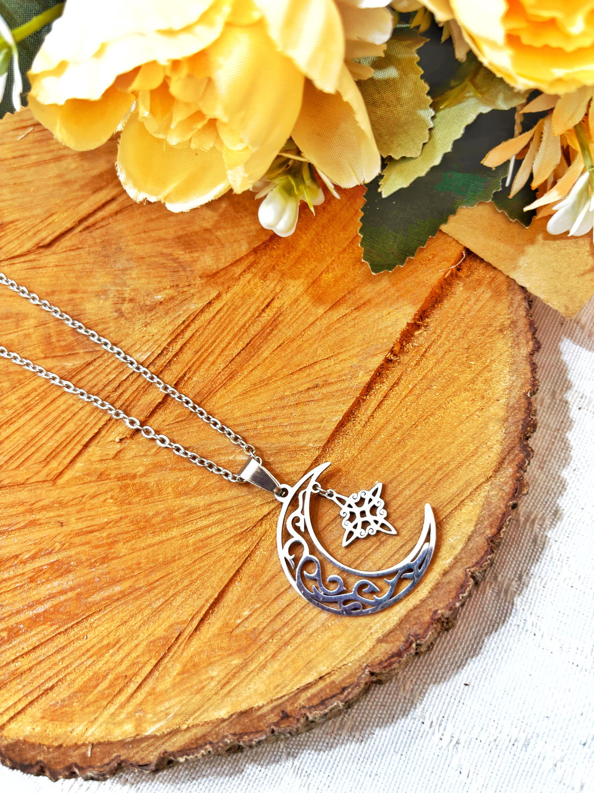Este collar combina un dije de Nudo de Bruja con un dise帽o de luna en acero, creando un accesorio elegante y lleno de significado. La cadena de acero resistente permite un uso diario c贸modo y seguro, ideal para quienes buscan llevar consigo un amuleto con intenci贸n.
