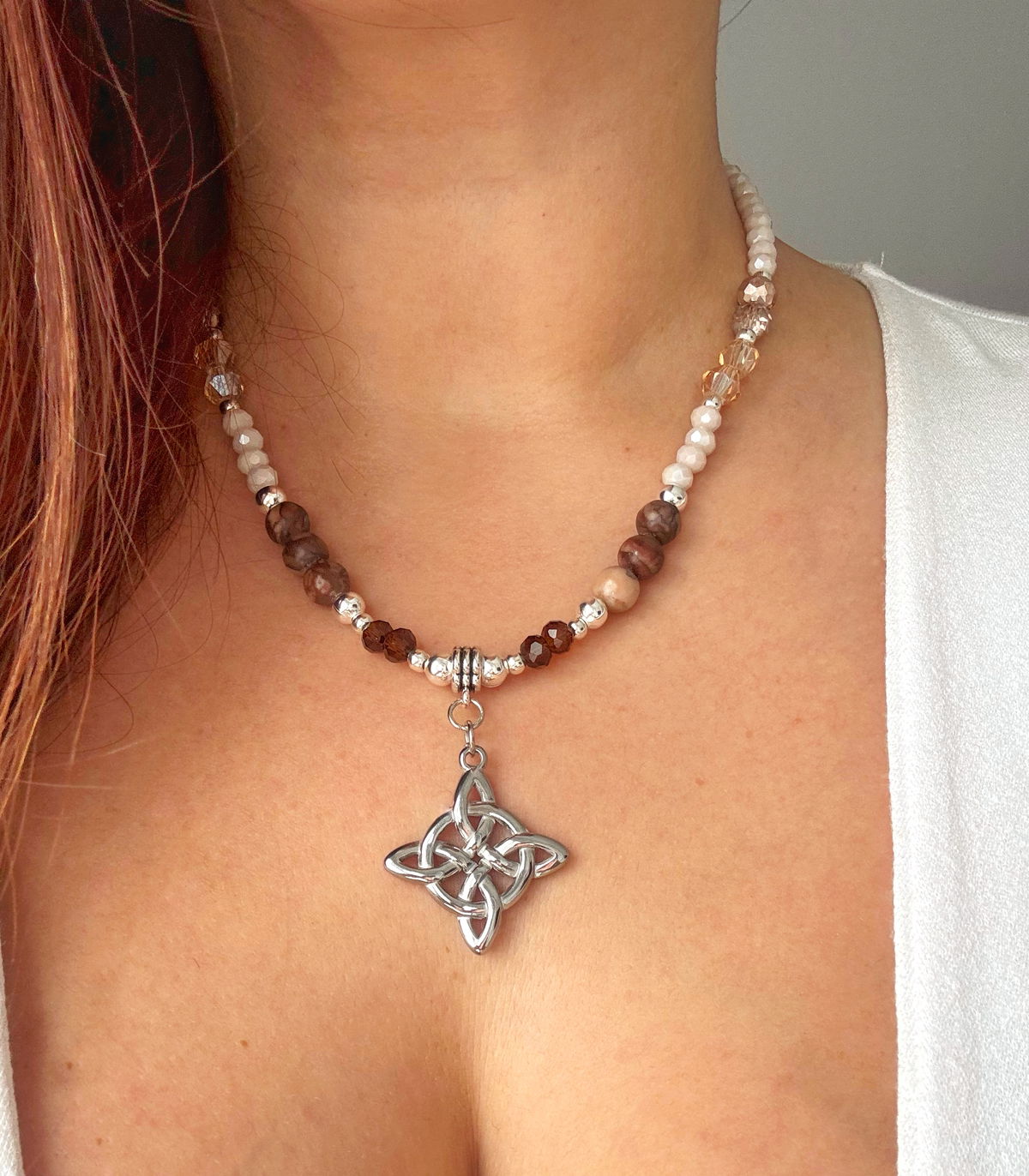 Este collar combina bolitas de metal, cristales de roca en diferentes colores con bolitas marmoladas que aportan textura y movimiento. En el centro, un dije de Nudo de Bruja en acero inflado (quirúrgico) se convierte en el protagonista: liviano, brillante y resistente.