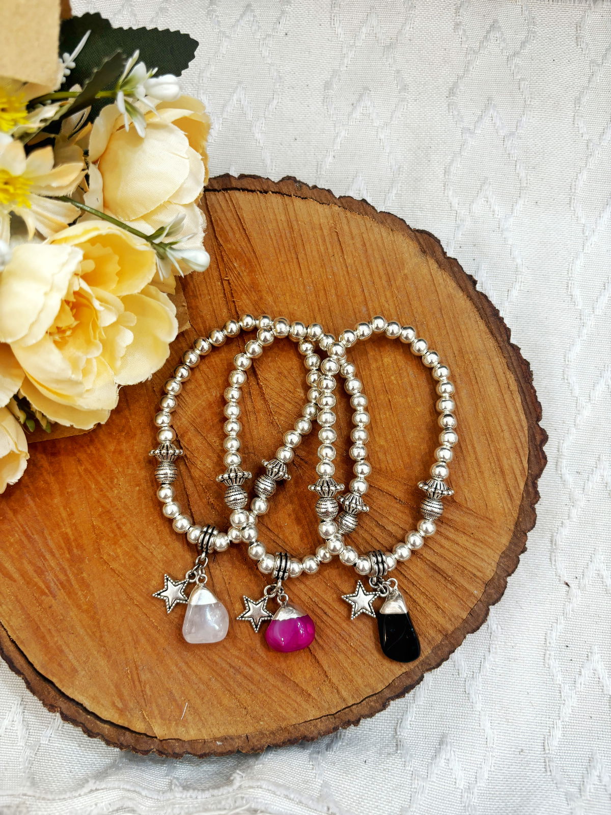 bolitas metálicas niqueladas y un portadije de fundición con piedras naturales y dije de estrella, creando un accesorio lleno de simbolismo y energía.