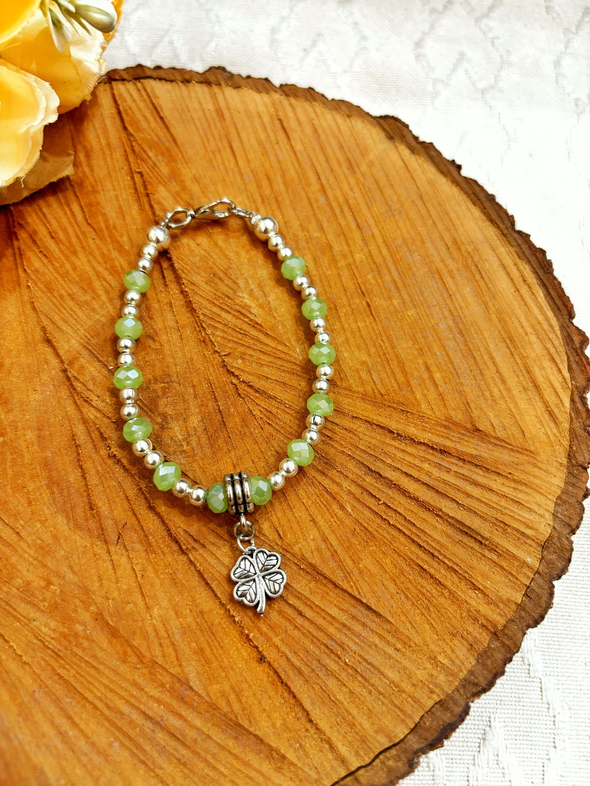 Esta pulsera rígida combina cristales de roca luminosos con bolitas niqueladas y un delicado dije de trébol, creando un accesorio delicado pero con presencia.