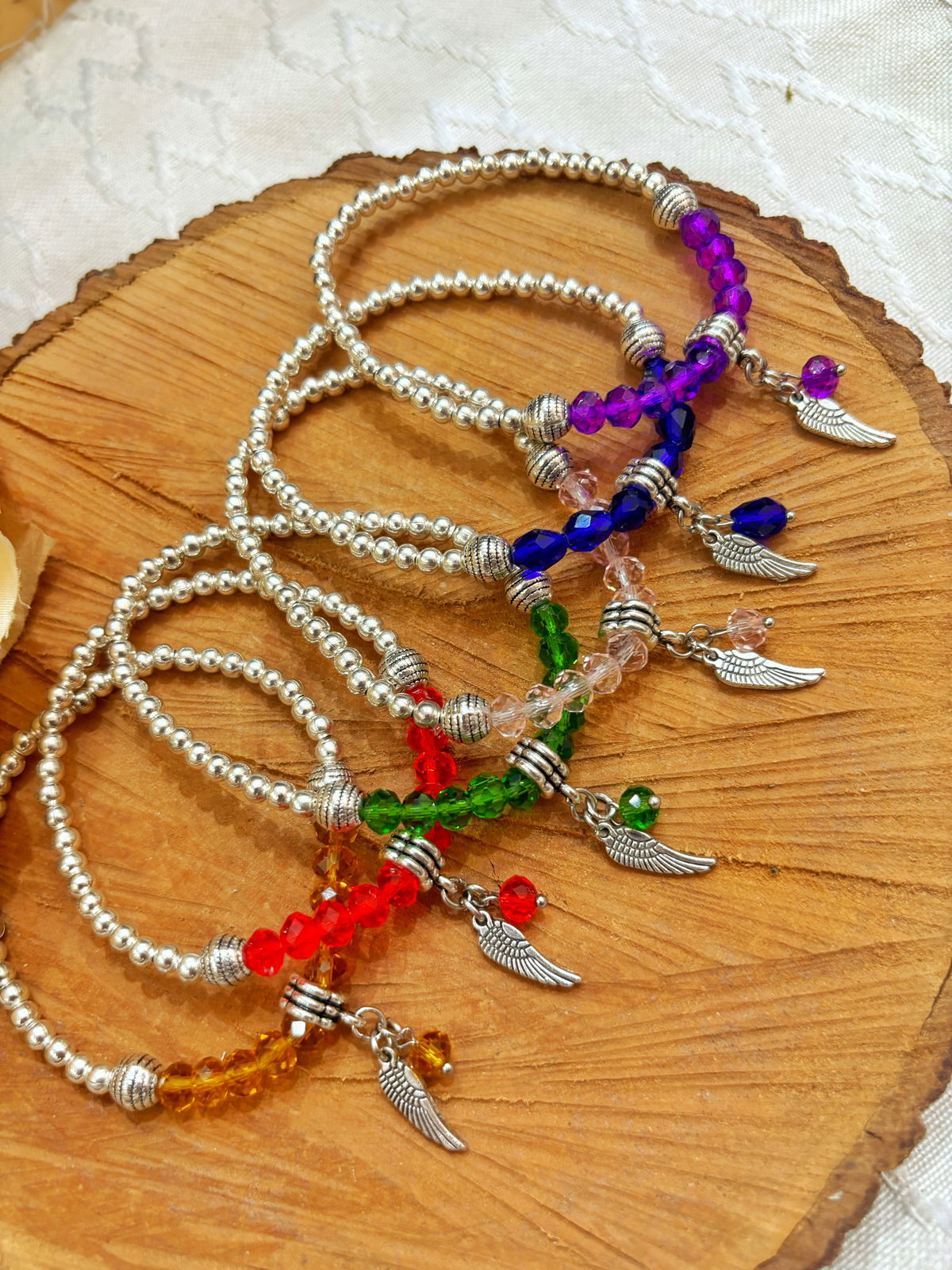 Esta pulsera combina cristal de roca en distintos colores (según el arcángel que elijas), bolitas niqueladas y un dije de alita que simboliza guía y protección celestial. Un amuleto para acompañarte con luz y asistencia espiritual en tu día a día.