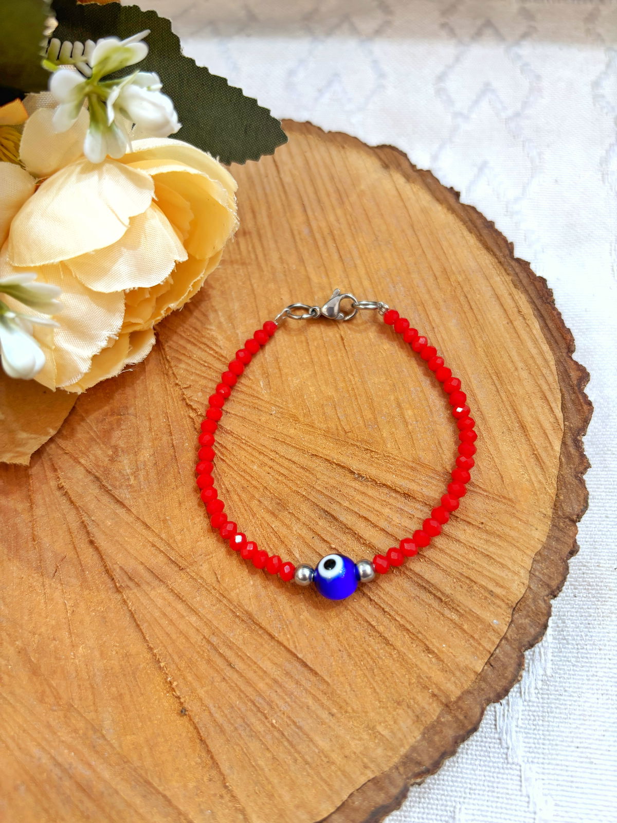 Esta pulsera rígida combina la resistencia del acero con la intensidad del cristal de roca opaco en tono rojo y el poder simbólico del Ojito Turco azul. Un diseño equilibrado entre energía y estilo.