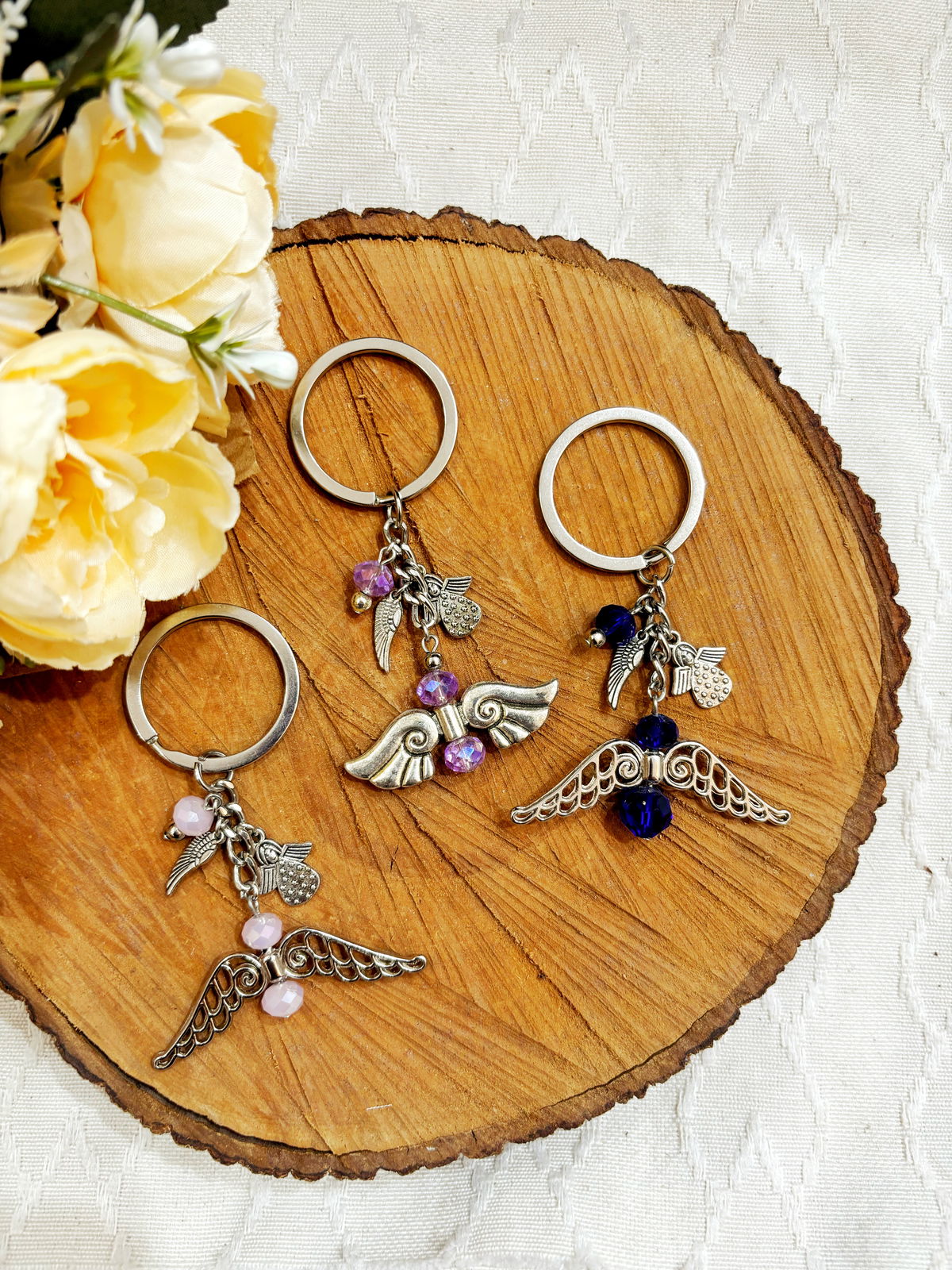 Llavero con anillo y dije angelito cada color representa un arcángel