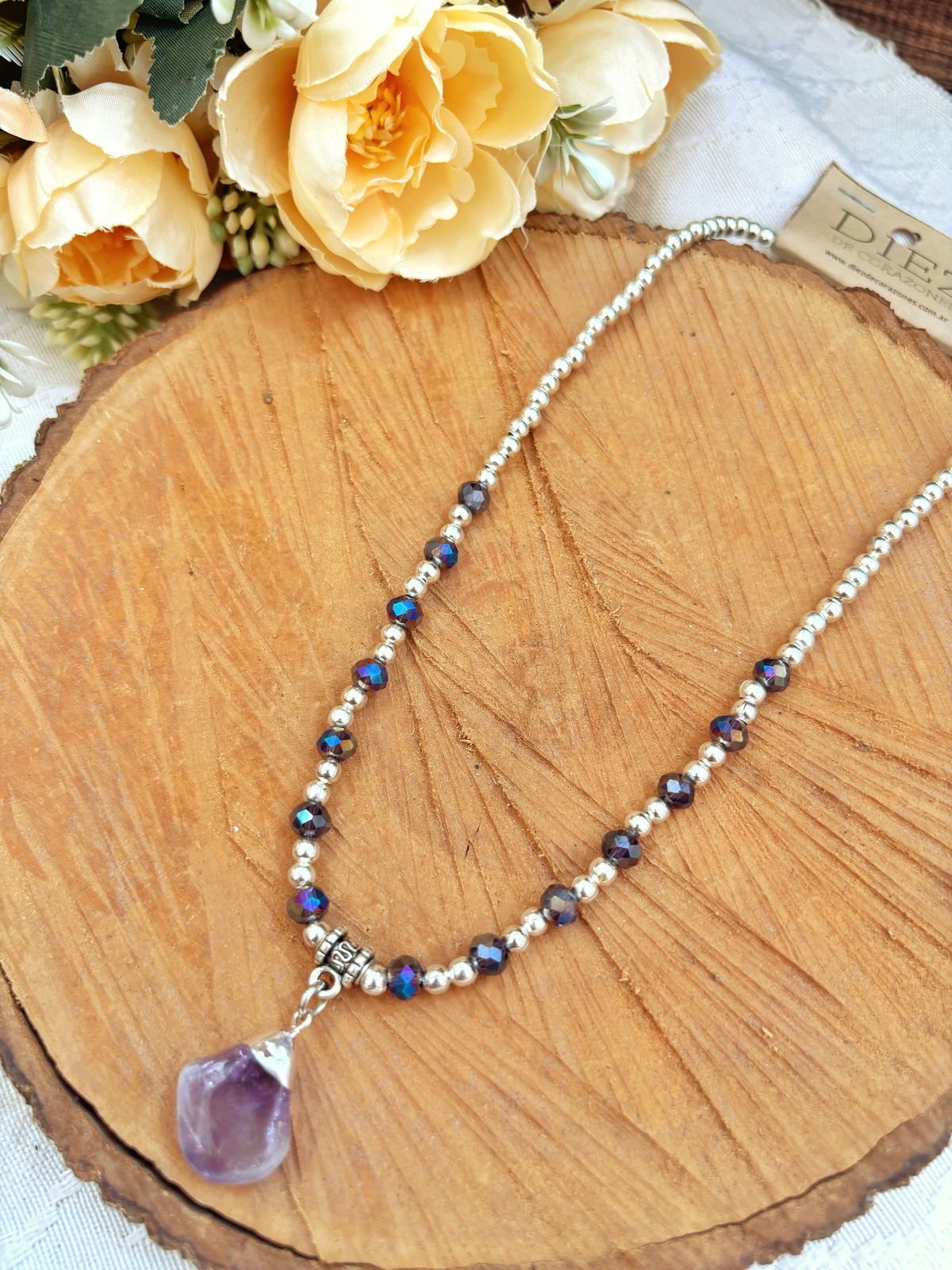 Este collar está realizado con cristal de roca, bolitas de metal niquelado y un dije central de amatista rolada, aportando armonía y energía positiva. Ideal para quienes buscan un accesorio elegante, versátil y con intención de bienestar.