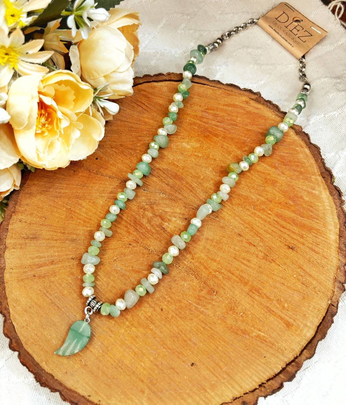 Este collar está realizado en fundición y bolitas de metal, con cristales de roca en diferentes colores que aportan brillo y armonía, y un dije de alita en tono verde, símbolo de protección y energía positiva. Ideal para quienes buscan un accesorio elegante, versátil y con intención.