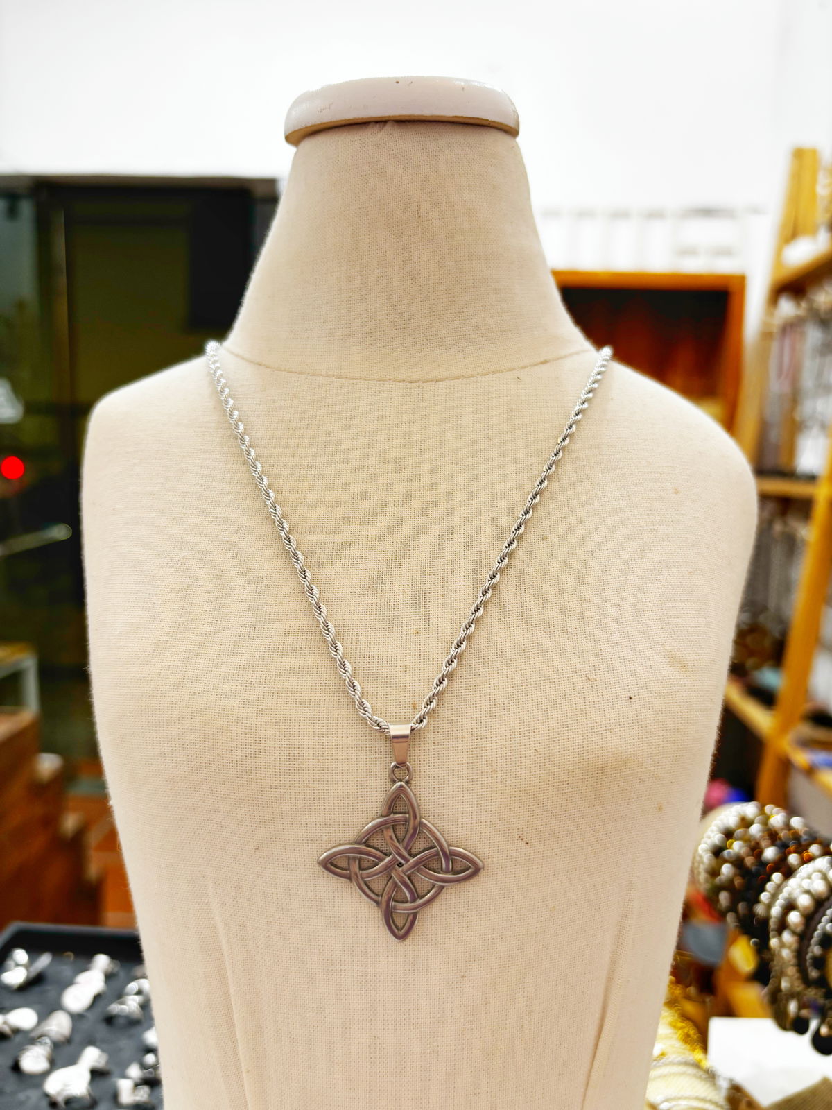 Este collar está realizado en acero, con cadena resistente y un dije central Nudo de Bruja, un símbolo ancestral de protección y armonía energética. Ideal para quienes buscan combinar un accesorio moderno con un amuleto cargado de significado.