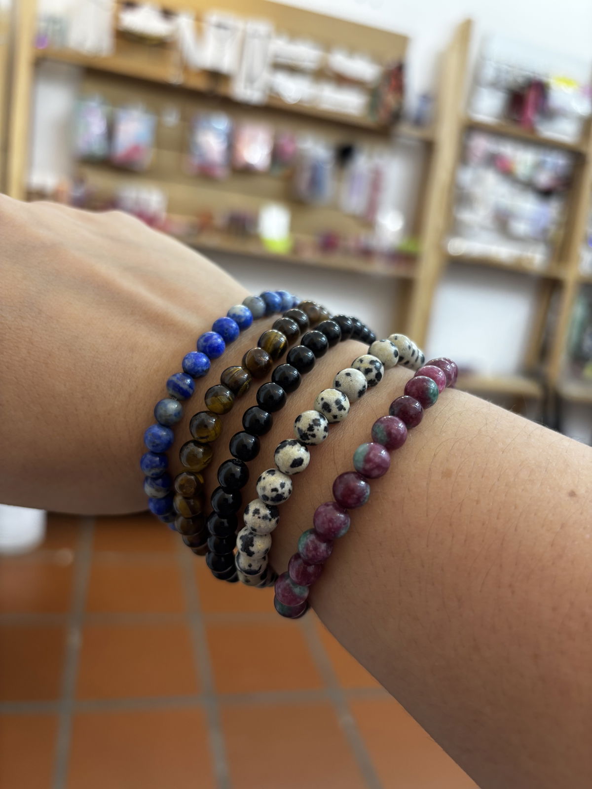 Pulsera elástica con bolitas de piedra natural y cierre acero