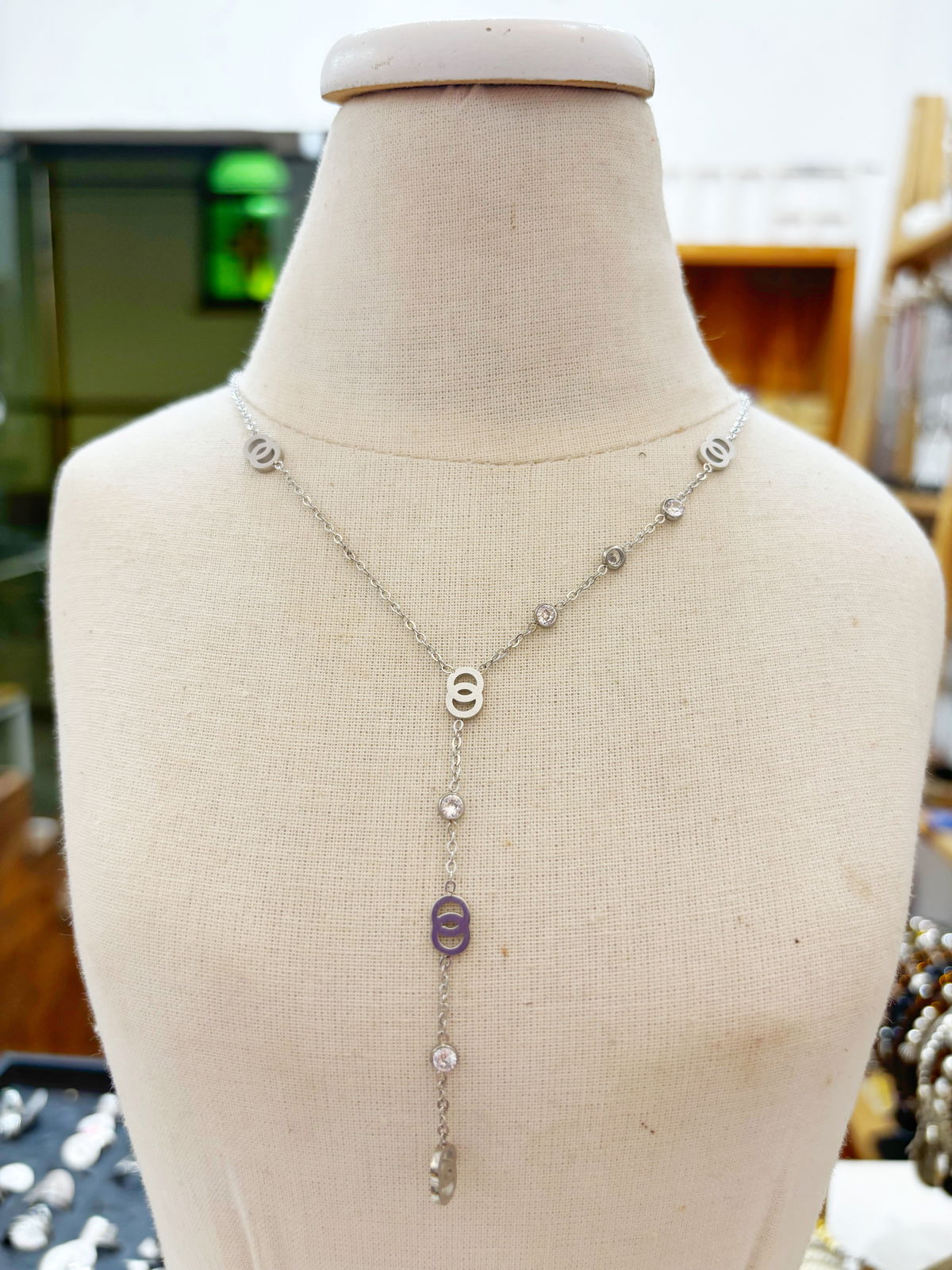 Este collar está realizado en acero quirúrgico, con cadena estilo corbatero y dijes tipo chapitas decorados con strass, creando un diseño minimalista pero llamativo. Perfecto para quienes buscan un accesorio elegante, versátil y fácil de combinar con cualquier look.