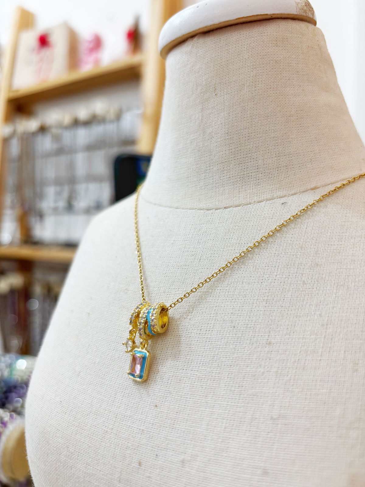 Este collar en acero dorado combina dijes colgantes tipo charms decorados con strass, creando un diseño dinámico y lleno de detalle. Ideal para quienes buscan un accesorio elegante, llamativo y fácil de combinar con distintos outfits.