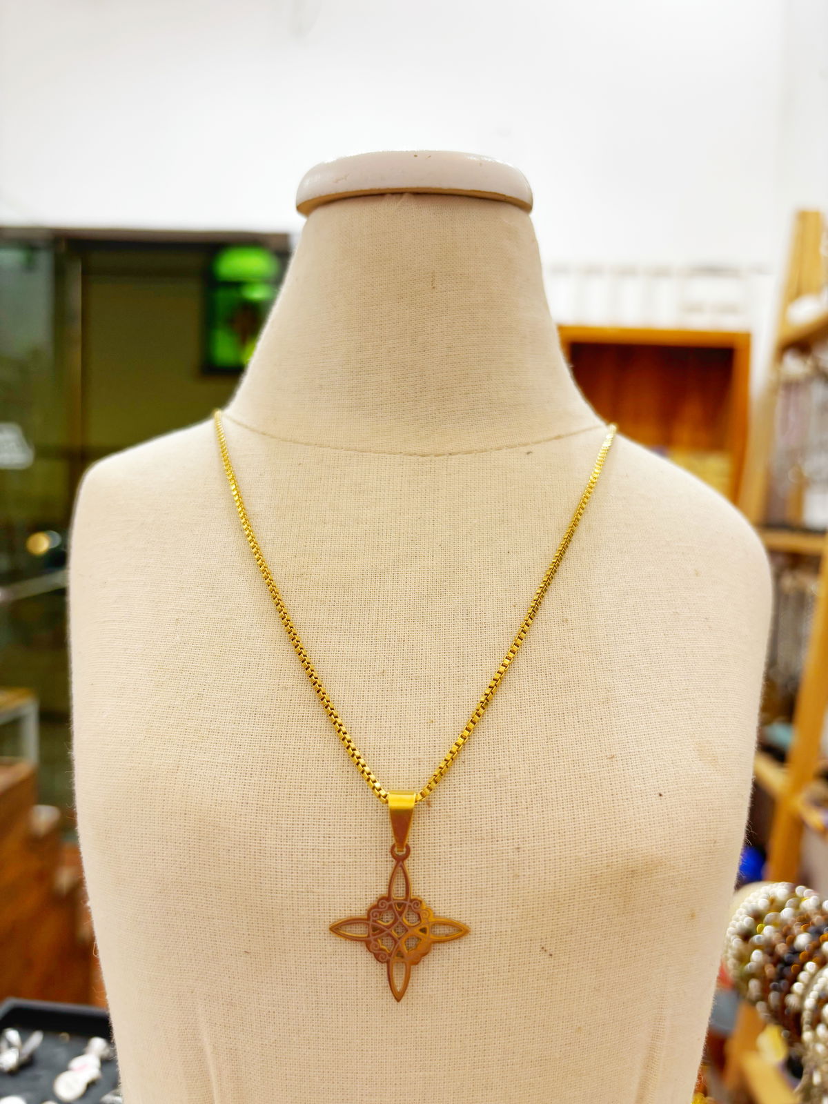 Este collar combina un dije de Nudo de Bruja en acero dorado con cadena resistente, creando un accesorio elegante y cargado de significado. Ideal para quienes buscan llevar consigo un amuleto de protección con diseño versátil y sofisticado.
