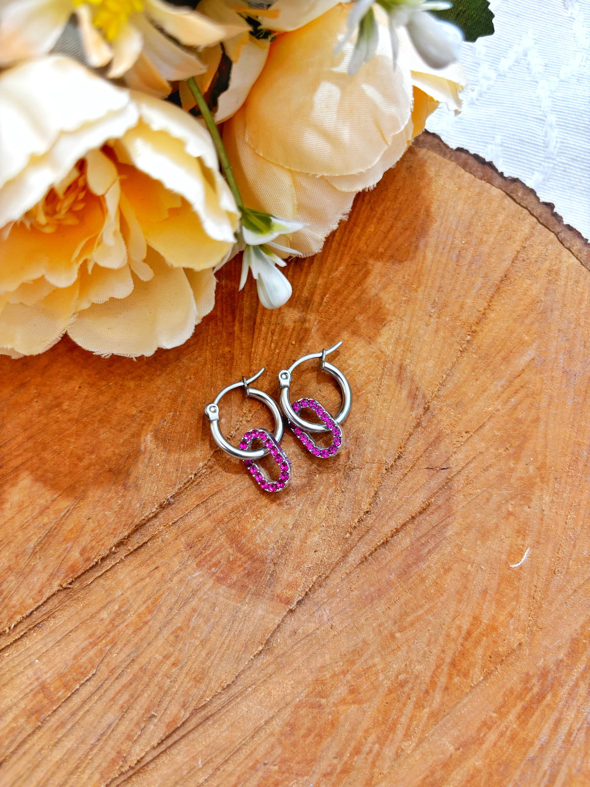 aros con argollita acero quirúrgico con dije ovalado calado con strass y baño