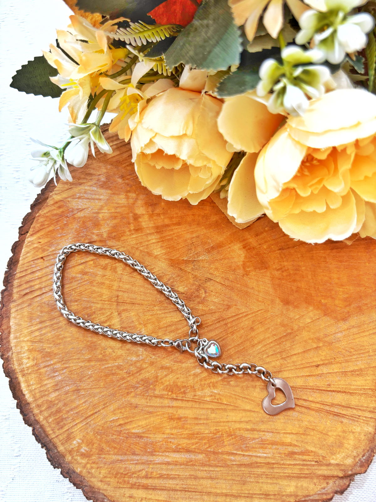 Esta pulsera combina una cadena de acero resistente con dos dijes de corazón: uno liso y protagonista, y otro más pequeño con cristal brillante que aporta luz y delicadeza. Una pieza simple pero con intención, ideal para usar todos los días.