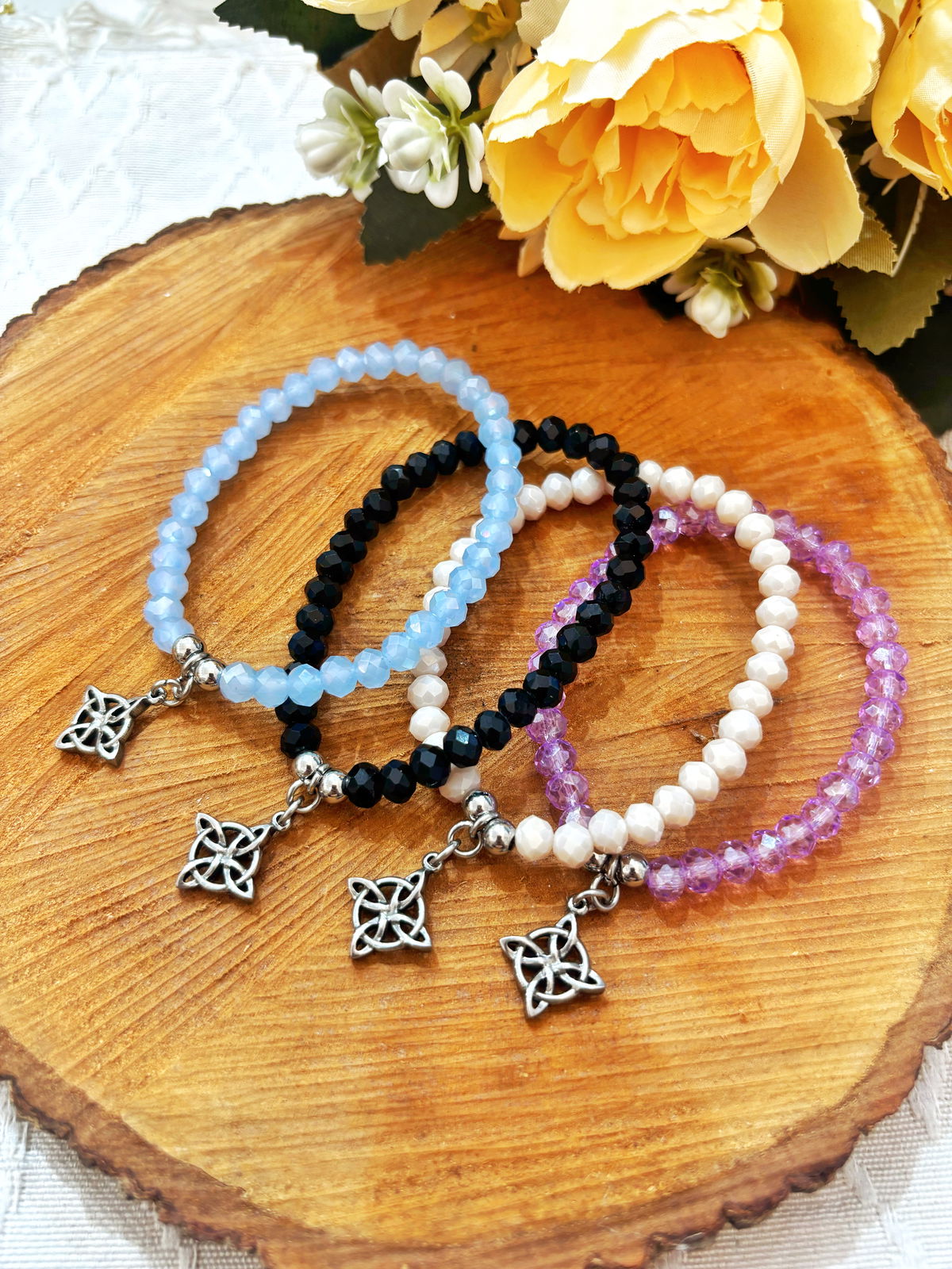 Esta pulsera combina cristales de colores (podés elegir tu tono favorito en la tienda) con el poderoso dije de Nudo de Bruja, creando un amuleto versátil que une estilo y simbolismo.