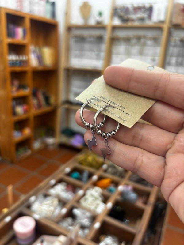 aro argolla en acero quirurgico con bolitas de acero y dije de rayo