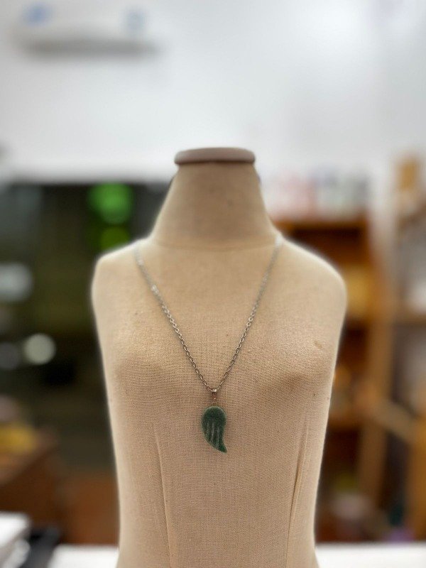 Collar con cadena de acero finita y dije central de piedra cuarzo verde en forma de alita