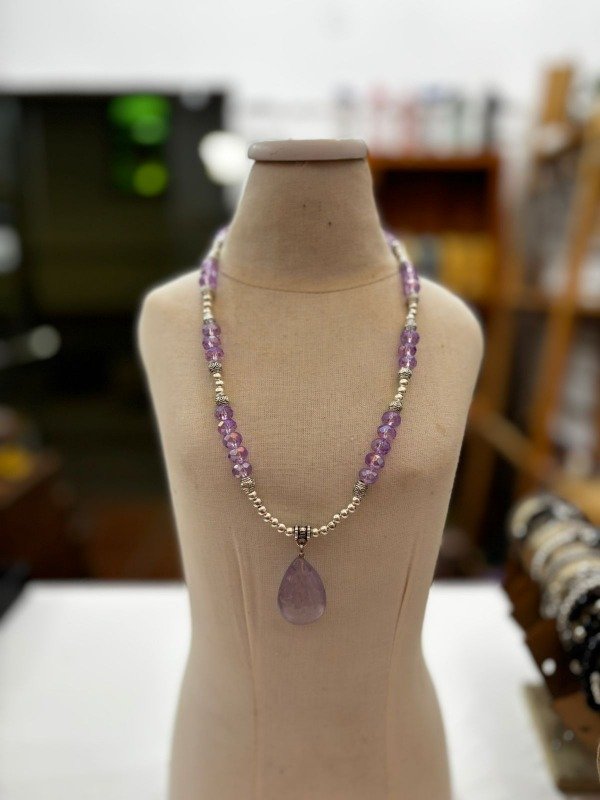 collar bijouterie con dije central amatista en gota, cristales tornasolados en violeta y metal niquelado blanco