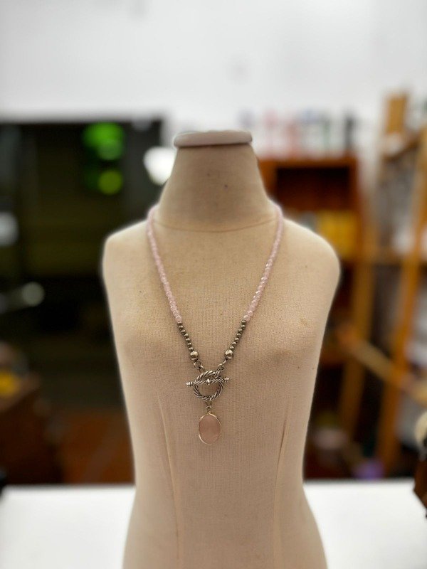 Collar metal y cristal de roca con dije de piedra cuarzo rosa central con cierre marinero