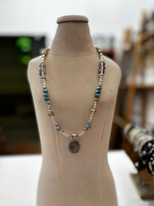 Collar con cristal de roca grande y dije central labradorita. Tiene cristales y bolitas de metal blanco