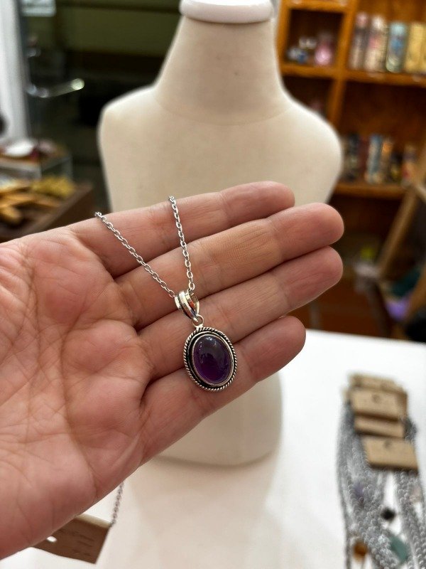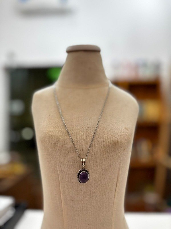 collar cadena de acero finita con dije de amatista en base de alpaca bañada
