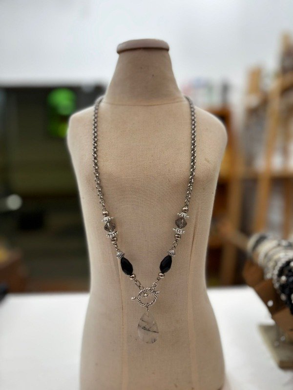 Collar cadena en acero, con dijes en fundicion y cristal de roca . cierre marinero y dije gota cuarzo con turmalina