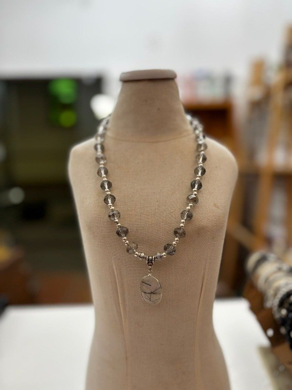 Collar con cristal de roca grande y dije ovalado cuarzo cristal con turmalina
