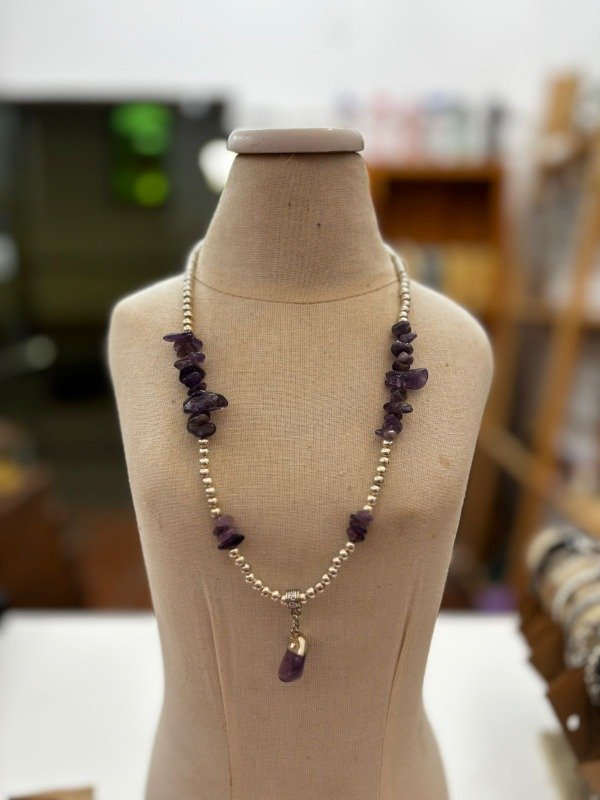 collar con bolitas de metal blanco con escallas y dije de amatista