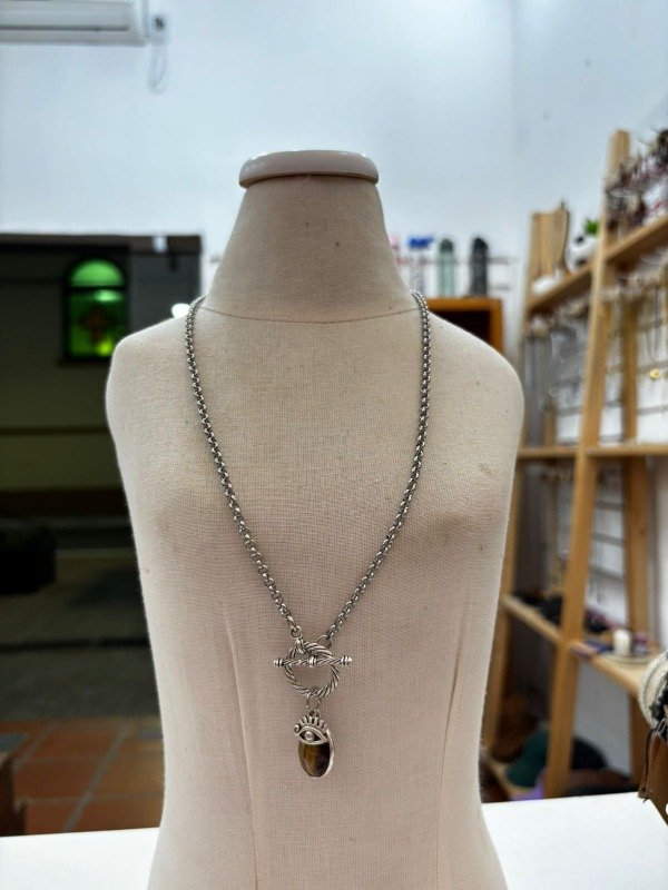 cadena de acero con dije central ojo de tigre ovalado con dije de fundición y cierre marinero fundición