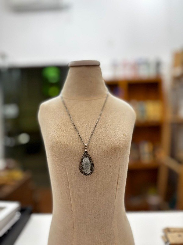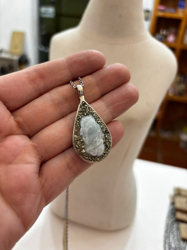 collar cadena de acero finita con dije de aguamarina con pirita alrededor en base metal