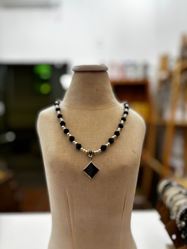collar con metal y cristal negro , con dije piedra piramide obsidiana negra.