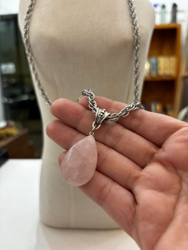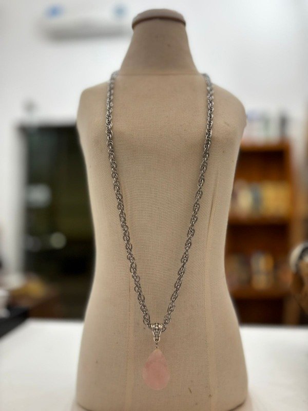 Collar con cadena larga de acero quirúrgico con dije de cuarzo rosa en forma de gota , portadije de fundición