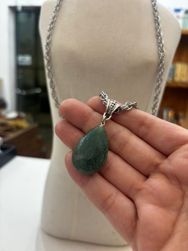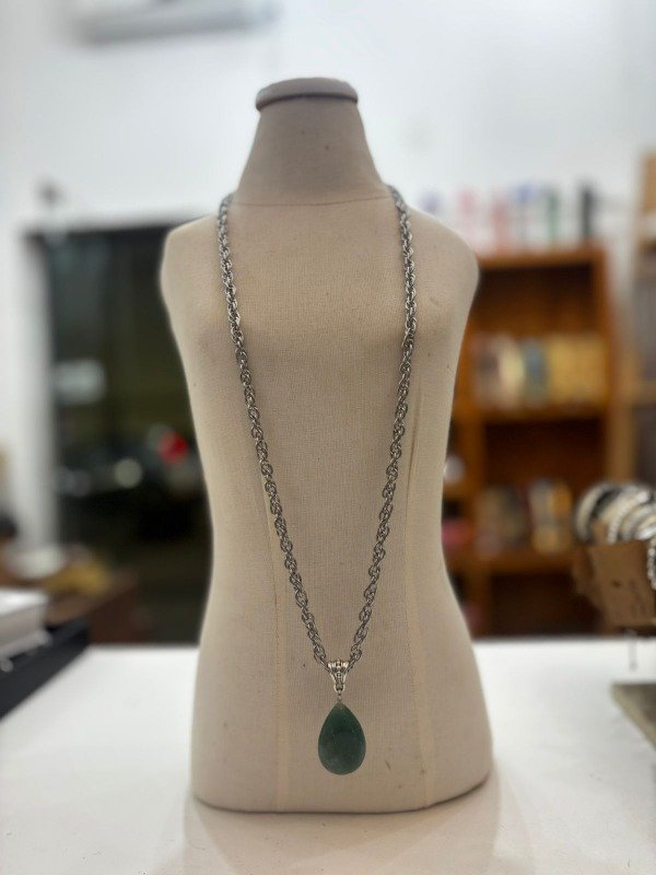 Collar con cadena larga de acero quirúrgico con dije de cuarzo verde en forma de gota , portadije de fundición