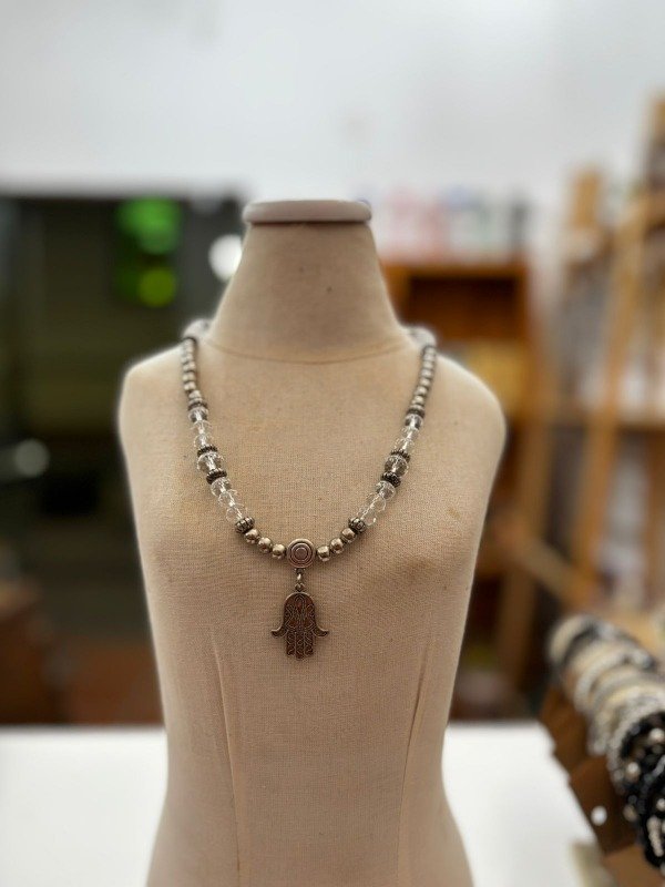 collar de cristal de roca con dije central mano de hamsa en tono cristal