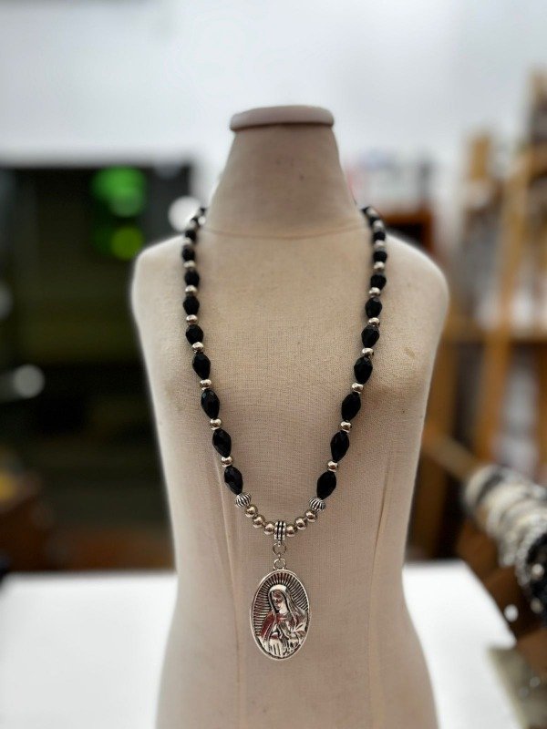 collar con metal y cristal negro en gota, con dije de san Virgen doble faz.