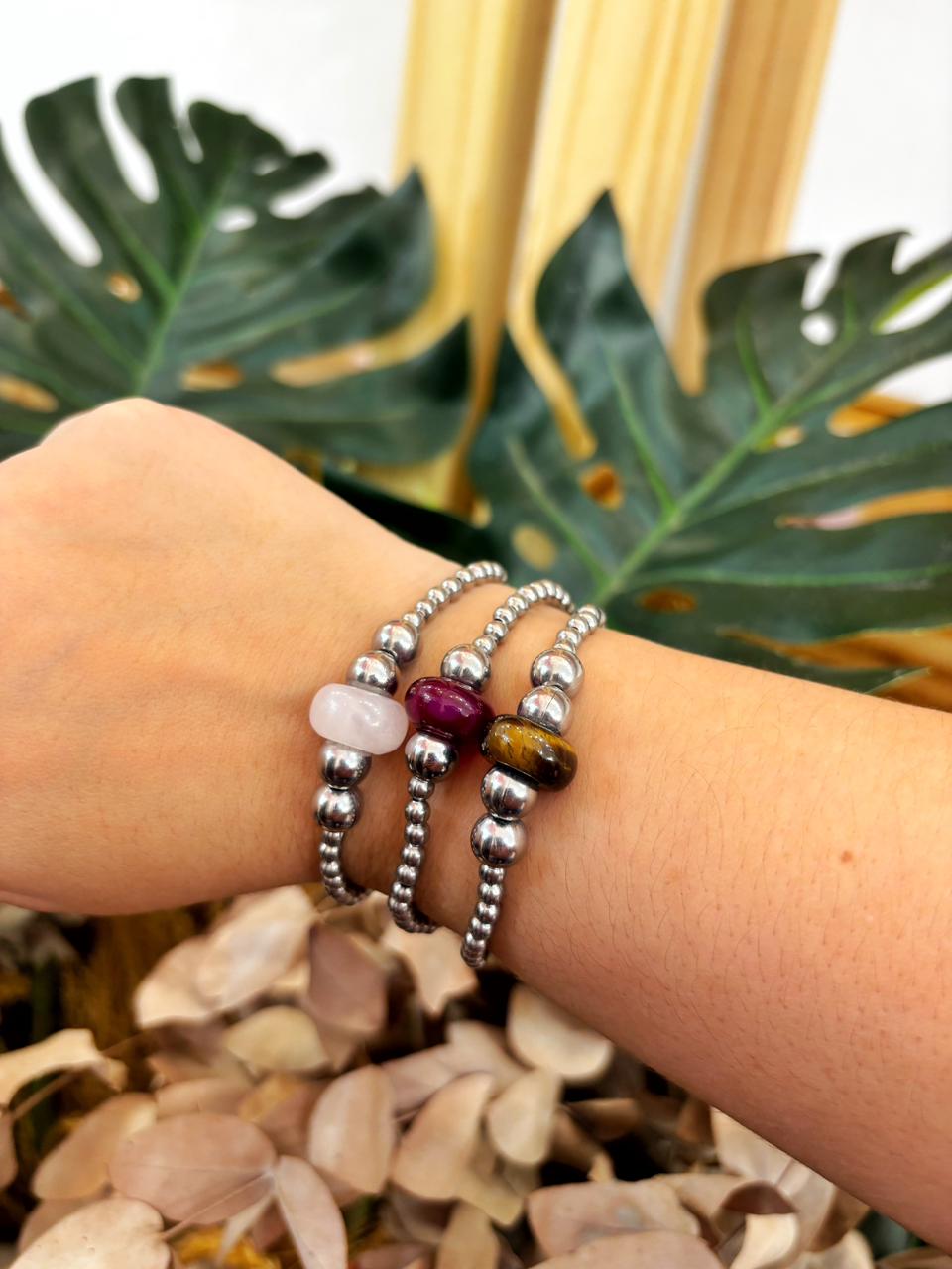 Esta pulsera combina bolitas de acero quir煤rgico con un dije central en forma de dona de piedra, creando un dise帽o elegante, resistente y con intenci贸n.